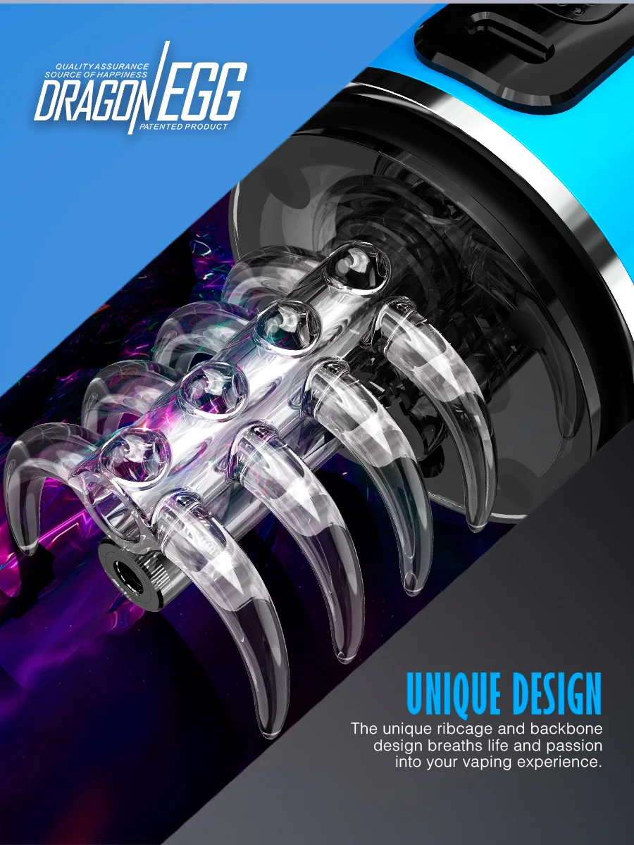 As the name suggests, it is designed to resemble a dragon egg or capsule shape, with a rounded body that upper half housing the battery and chamber. The bottom half houses the water chamber and rib-shaped percolator.